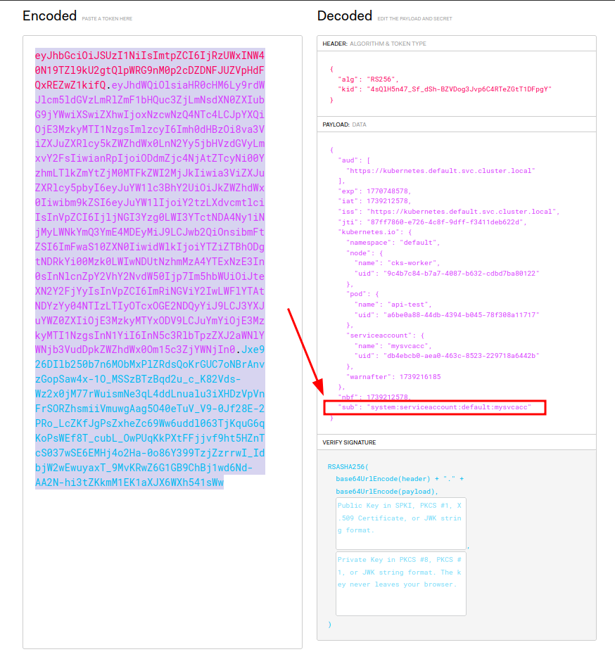 kubectl exec -it api-test -- cat /run/secrets/kubernetes.io/serviceaccount/token && echoYou can visit the https://jwt.io/ to and paste the token to see the details.